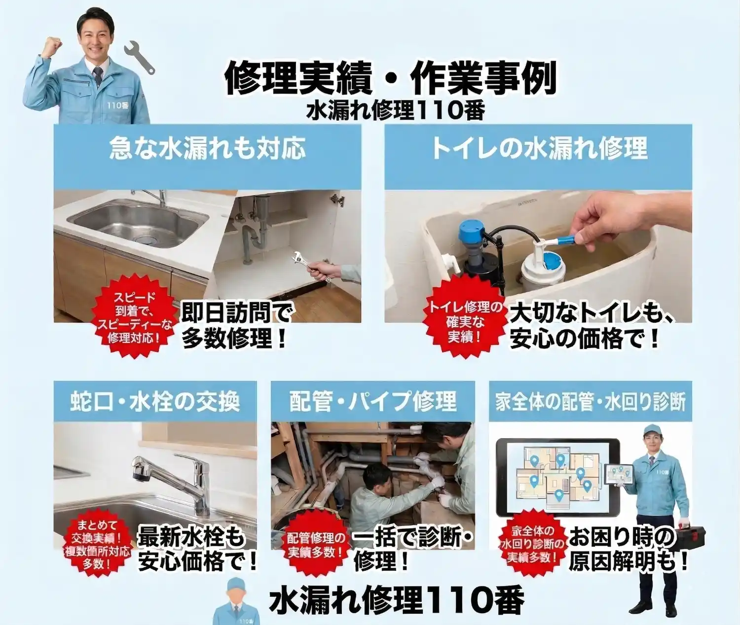 水漏れ修理110番は、全国の各自治体から認可を受けた「水道局指定工事店(指定給水装置工事事業者)」として施工を行っています。 国家資格を持つ水回りのプロフェッショナルが多数在籍しており、軽度な水漏れやつまり修理から、給排水管の引き直し、ポンプの交換といった大規模な工事まで幅広く対応可能です。